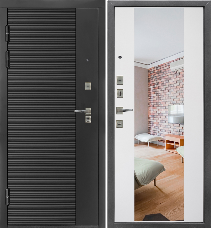Входная стальная дверь с замком No-Key улучшенной конструкции. Внешняя сторона двери – фрезерованная декоративная панель МДФ 10 мм, цвет “Темный графит”. Внутренняя сторона двери – фрезерованная декоративная панель МДФ 10 мм, цвет “Белая” с зеркалом. Уникальный взломостойкий замок с функцией No-Key: замок-автомат с возможностью бесключевого закрытия и открытия одним движением дверной ручки повысит Ваш комфорт и удобство пользования. Толщина металла полотна двери – 1,1 мм. Толщина металла рамы двери – 1,2 мм. Наполнение дверного полотна: базальтовая плита плотностью 60кг/м3. Отличное решение для вашей квартиры, офиса, тамбура, идеально для любого помещения внутри здания. Оптимальное сочетание дизайна, надежности, великолепная тепло-шумоизоляция. Эксперты отрасли советуют, как лучшее сочетание цены и качества в своем классе. Дверной блок наружного открывания, размеры стандартного дверного короба 860х2050мм и 960х2050мм. Дверь может быть как правого так и левого открывания. *Производитель оставляет за собой право вносить технические изменения в конструкцию модели без предварительного уведомления заказчиков*.